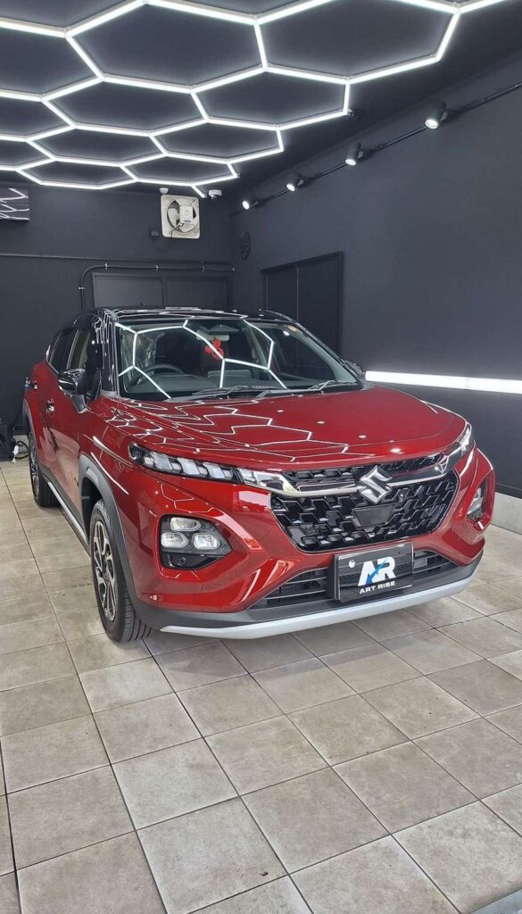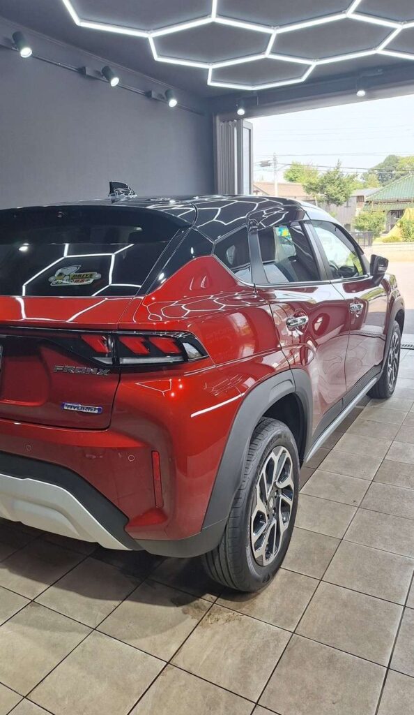 本日ご紹介するお車はスズキ フロンクスでボディカラーはオピュレントレッドパールメタリック ブラック2トーンルーフです。こちらのお客様は茨城県下妻市よりご来店くださりました。新車でのご入庫のため、塗装状態を確認後、磨きなしで進めさせていただきました。