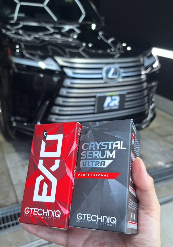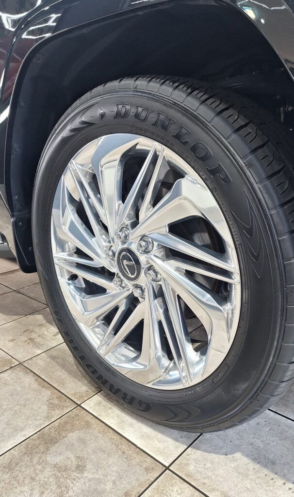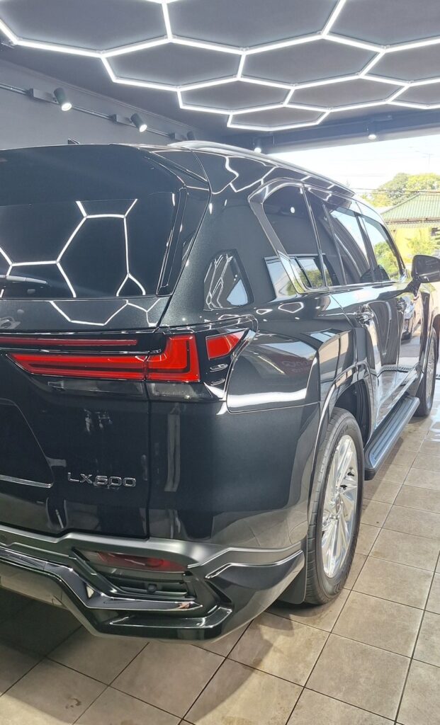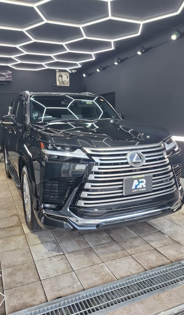 コーティングは当店最高峰のセラミック「ジーテクニッククリスタルセラムブラック」を施工しました。光沢・防汚性・耐久性すべてに優れた、ワンランク上の仕上がりとなりました。深みのある艶が際立ち、LX600の存在感がより一層引き締まった一台に仕上がっています。