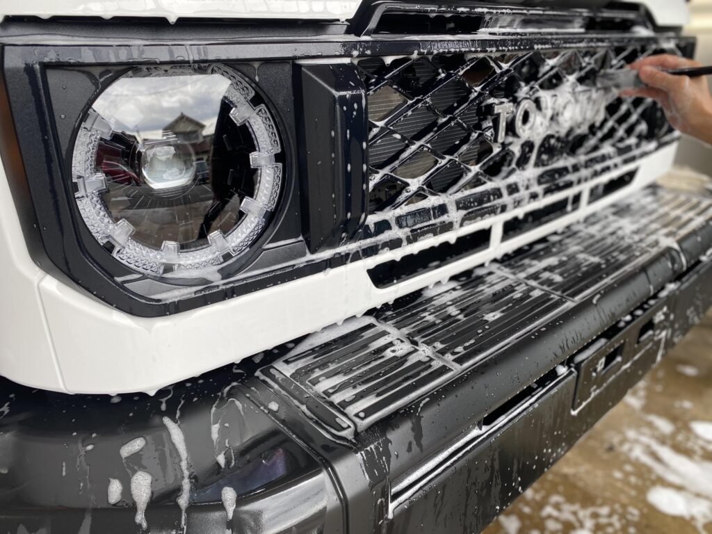 隙間に汚れが溜まりやすいため、ウォッシュミットが届かない箇所はソフトブラシを使い、優しくアプローチしていきます。