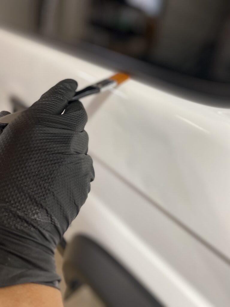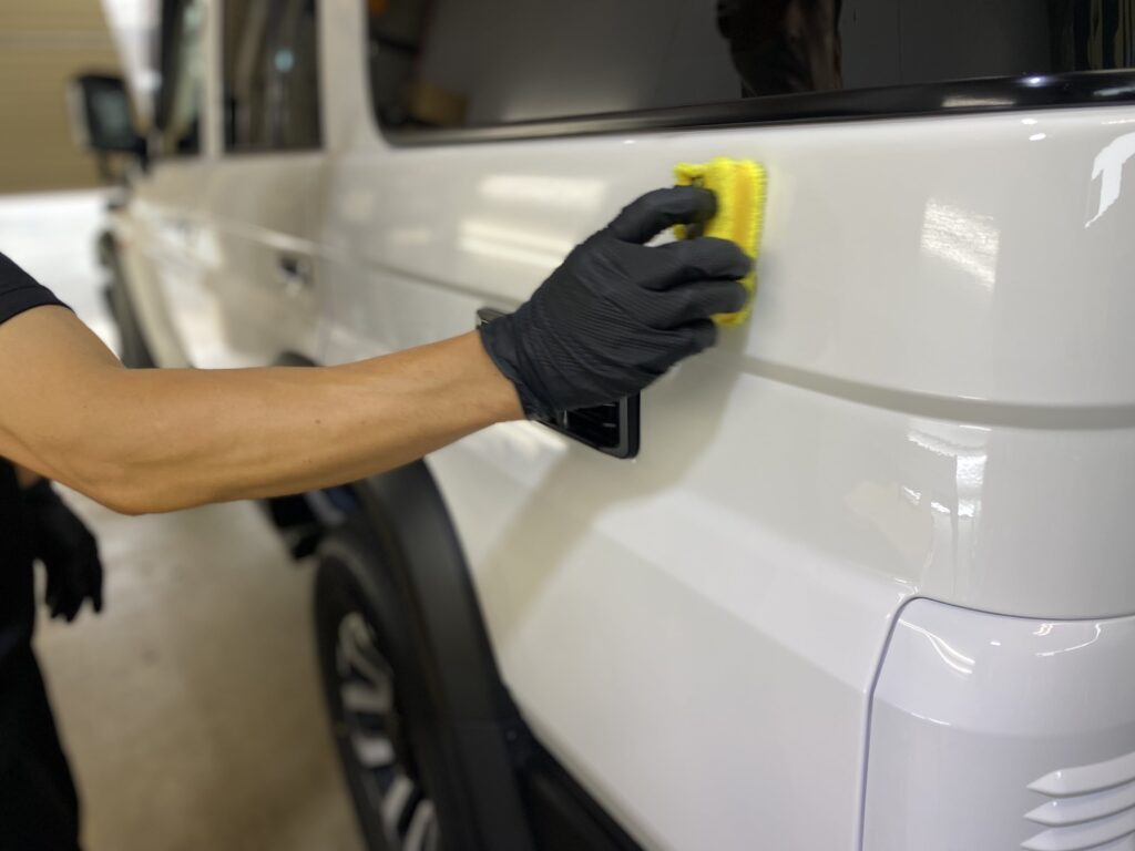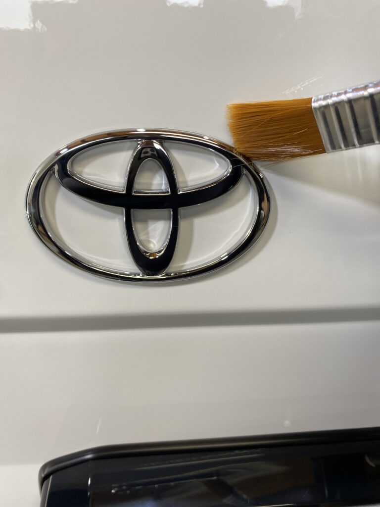 エンブレムや窓ガラスの枠など汚れが溜まりやすく頑固なため、スケール除去剤を使用して汚れを落としていきます。