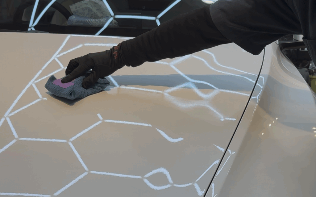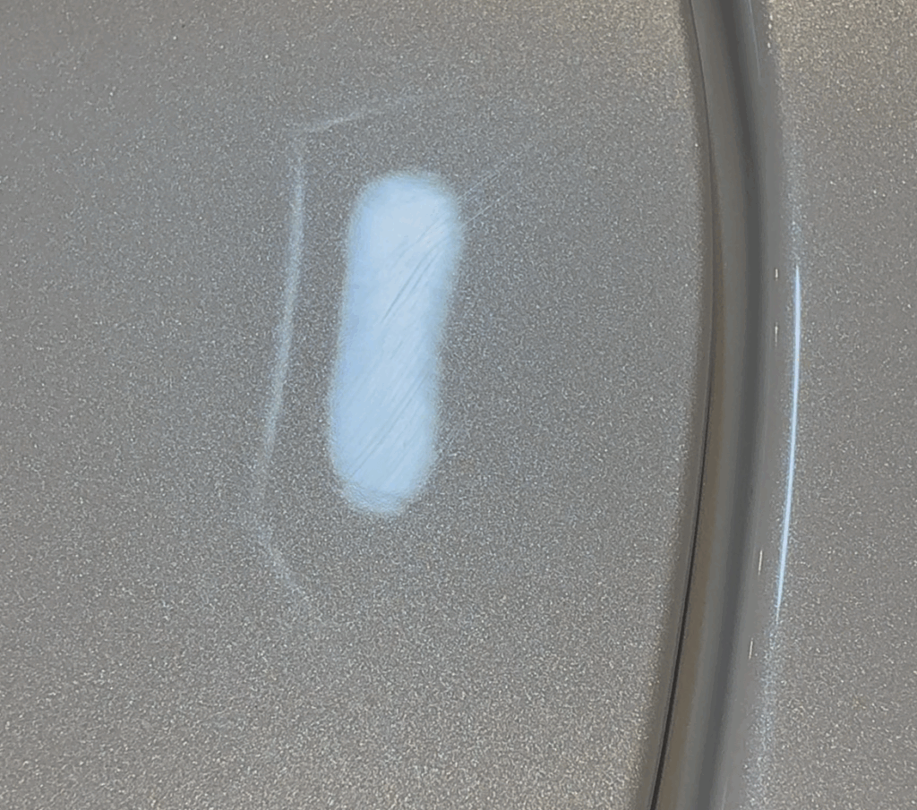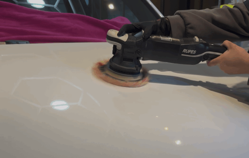 今回のモデルYには白いお車ですが若干の薄傷が多数ございました。そちらを磨きで整えていきます。