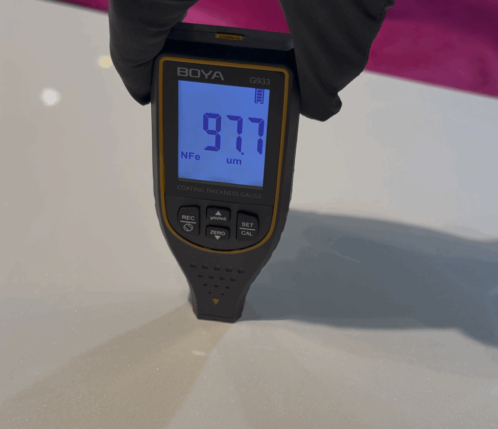 テスラの膜厚は高級車と比べると厚いわけでもないでもないので薄傷や汚れ、地方特有の樹脂汚れの固着を防ぎたい方は磨きで下地を整え、コーティングの効果を最大限に引き出すことがおすすめです。